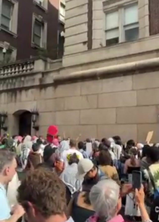 large crowd of people gathered on a city street in front of a building. The building has a stone facade and windows with dark frames. The crowd consists of people of various ages and ethnicities. Many are wearing keffiyeh scarves. A few people are holding signs, including one that reads "CEASE FIRE NOW". There is also a large red flower prop in the crowd. Some people are filming or taking photos with their phones. The scene appears to be a protest or demonstration.