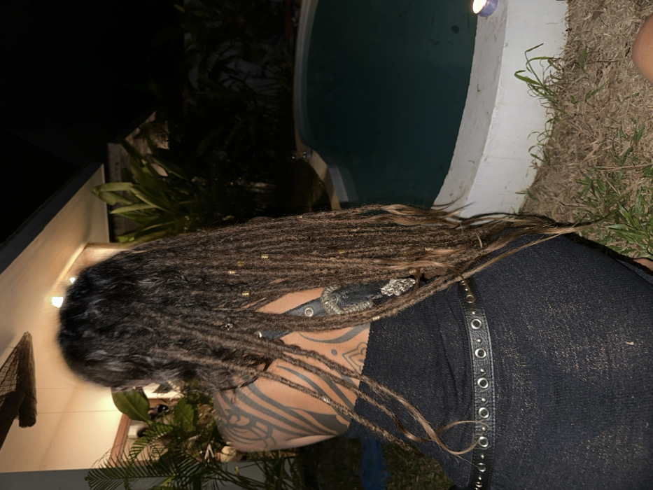 This image captures an outdoor, nighttime scene in Moo 4, Thailand. A single individual is depicted from behind, seated or kneeling on the ground, facing away from the camera. The person has long, dark brown dreadlocks, many reaching their waist, and some contain small metallic beads. Extensive black tribal-style tattoos are visible on their left shoulder and upper back. They wear a dark, textured, form-fitting garment, accessorized with a black belt featuring metal eyelets around the waist. A dark strap with a metallic, decorative buckle is present on the upper back, possibly part of an accessory or garment. To the right, a small, kidney-shaped swimming pool with light blue water and a white concrete edge occupies the mid-ground. A lit candle in a white container rests on the ground near the pool's edge. The immediate foreground consists of sparse grass and dry earth. In the background, dense tropical foliage and a partially visible building with an illuminated overhang and a woven fixture are present.