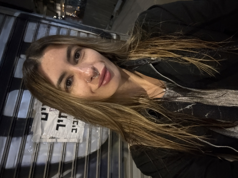 A woman with long, light brown hair, a nose ring, and light makeup looks at the camera. She wears a gray shirt and a black jacket. The background consists of a gray, corrugated metal wall with a piece of paper taped to it containing black writing. The scene appears to be outdoors at night or in a dimly lit area. The photo is taken from a slightly high angle.