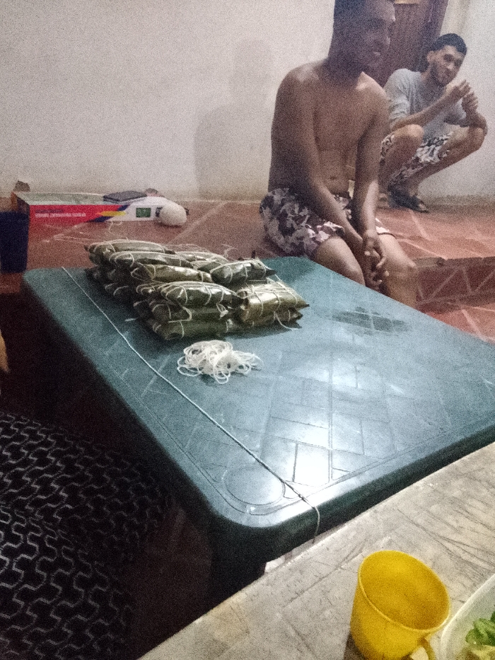 A stack of wrapped hallacas sit on a green plastic table next to loose string. A bare-chested man wearing shorts is seated behind the table. Another man is crouching nearby. A yellow cup is on a table in the foreground. Other items are located in the background including a box, a white object, and a dark cup. The room has tiled floors and white walls.