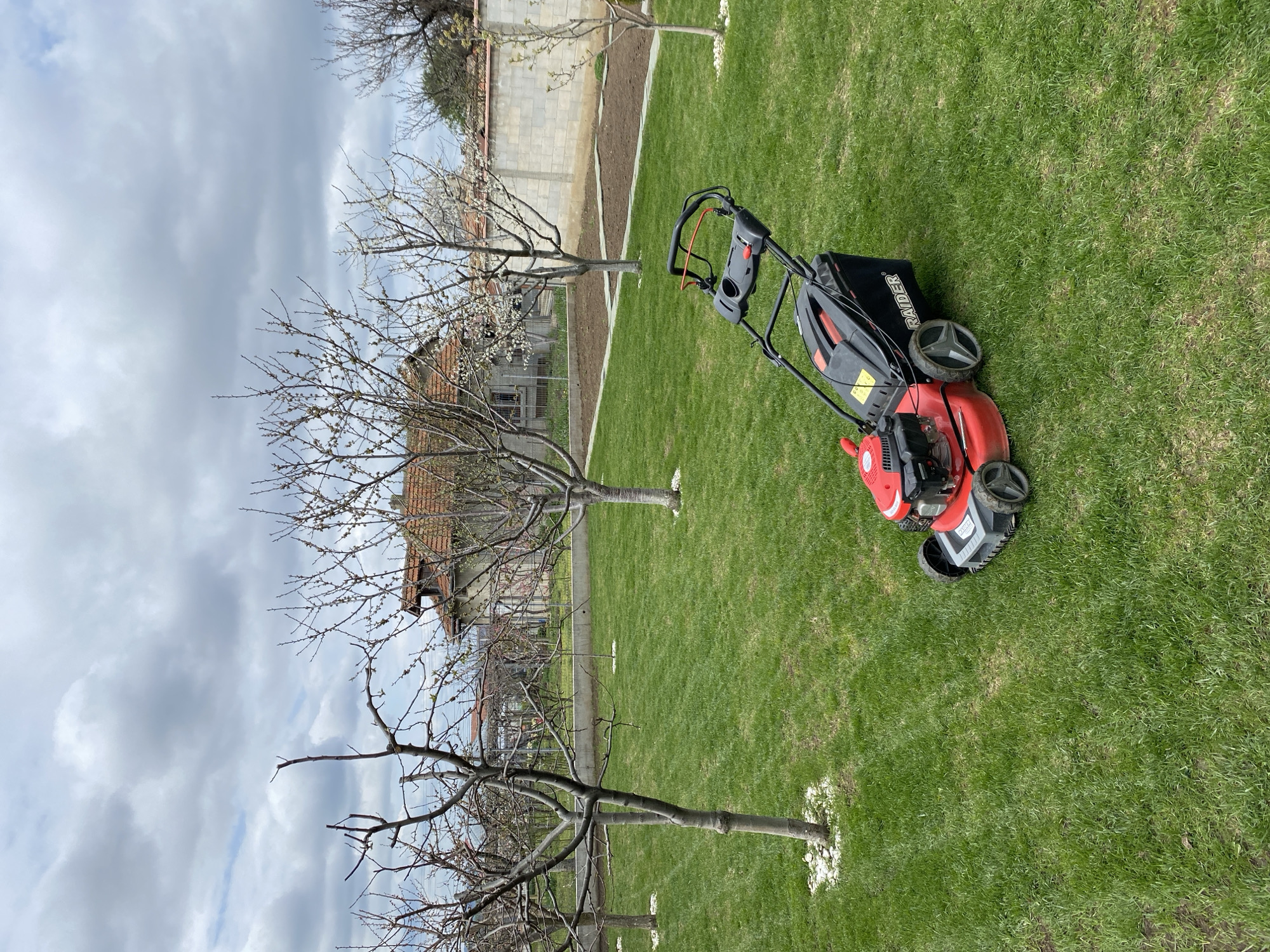lawnmower on a grassy lawn in Tervel, Bulgaria. The lawnmower is red and black and appears to be a Raider brand. Three bare trees are planted in the grass. In the background, there is a building with a red-tiled roof and a concrete block wall. The sky is cloudy.