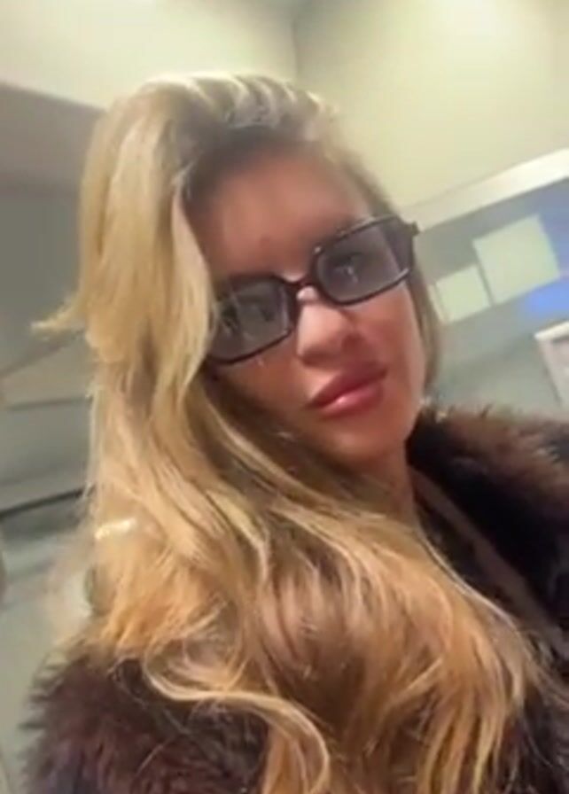 A woman with long blonde hair and dark glasses is standing on a train. She is wearing a brown fur coat. The train is red and yellow. The woman is looking around and appears to be filming herself.