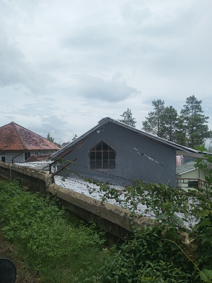 A gray building with a prominent window stands behind a concrete wall overgrown with vegetation. A section of roof with barbed wire sits on top of the wall. A building with a red roof appears to the left. Pine trees are visible in the background under a cloudy sky. Green foliage fills the foreground.