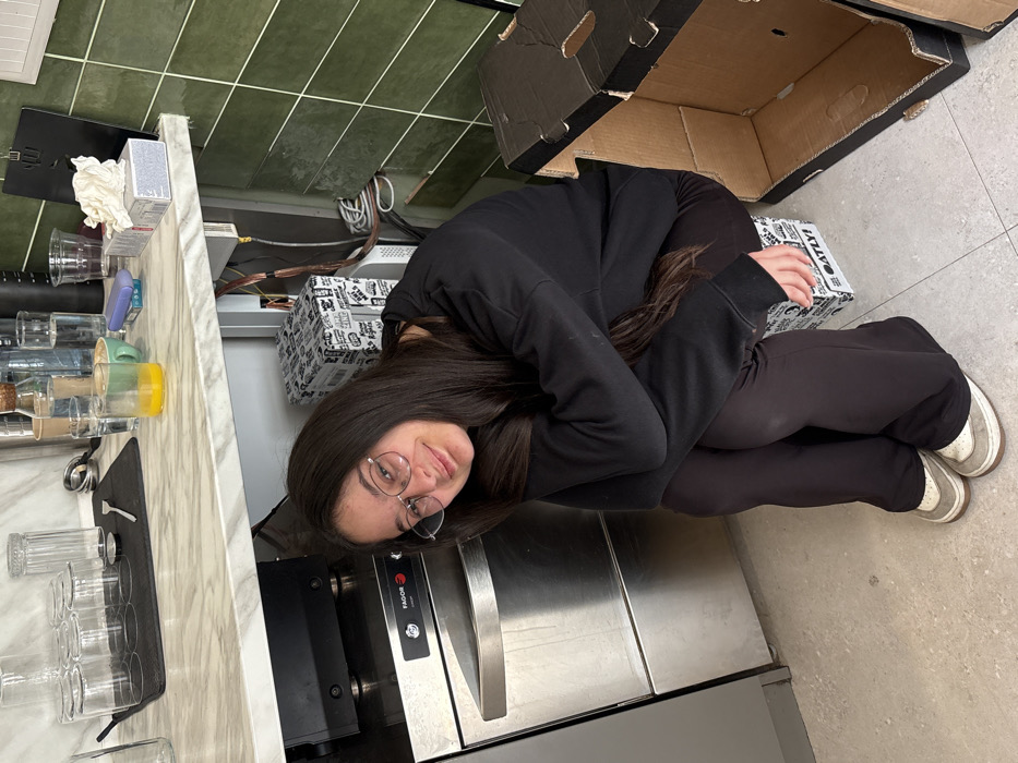 An individual is depicted indoors, likely in a commercial kitchen or bar area within Varna, Bulgaria. A female with long dark hair, wearing round metal-framed glasses, a black long-sleeved top, dark trousers, and light-colored sneakers, is positioned on a patterned "OATLY!" cardboard box on a light grey tiled floor. She is leaning forward, with her arms clasped around her knees, and is smiling towards the camera. To her left, a stainless steel FAGOR AD-50 commercial dishwasher is visible. Behind her, under a light marble-patterned countertop, exposed electrical wires and a second patterned cardboard box are present. To her right, a larger, open cardboard box with black trim rests on the floor. The countertop above features multiple clear glass tumblers inverted on a black drying mat, various other glassware, bottles, a cup containing orange liquid, a light green ceramic cup, a purple object, and a small white box with a crumpled white napkin on a black clipboard. The wall in the upper right background is tiled with dark green horizontal tiles.