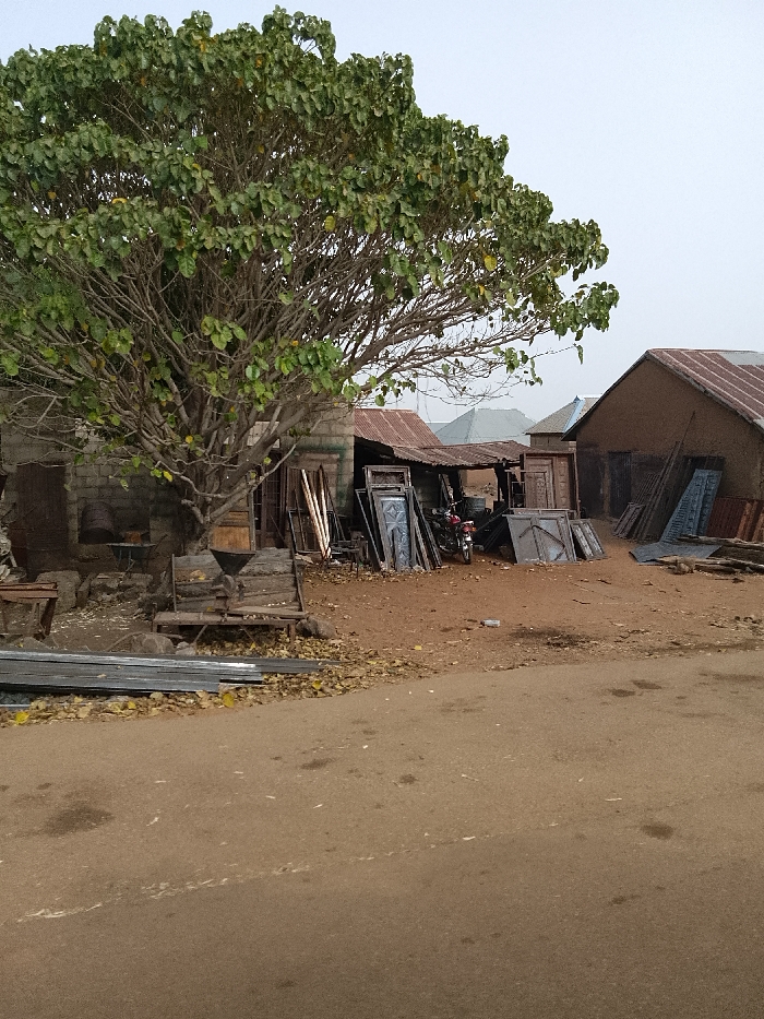 The image displays an outdoor scene in Minting Chip, Nigeria, under an overcast sky. A brown, unpaved road or compacted earth path occupies the foreground. To the left, a large, deciduous tree with dense green and yellowish foliage stands over reddish-brown dirt, which is scattered with dry leaves. Behind the tree, a structure made of grey concrete blocks is partially visible. Adjacent to it, centrally positioned, is a lean-to workshop or storage area with a corrugated metal roof. This area contains multiple stacked metal doors, door frames, and metal sheets, some featuring embossed patterns. A red and black motorcycle is parked beneath the lean-to. To the far right, a building with mud-colored walls and a rusted corrugated metal roof has additional metal sheets and lumber leaning against its exterior. Distant structures with similar roofing are visible in the background. On the ground in the lower left, stacks of long, rectangular metal profiles are present. Under the large tree, a wooden structure resembling a bench or platform supports a piece of equipment with a funnel-shaped top, possibly a rudimentary grinder. No individuals are present, and no actions or interactions are depicted.