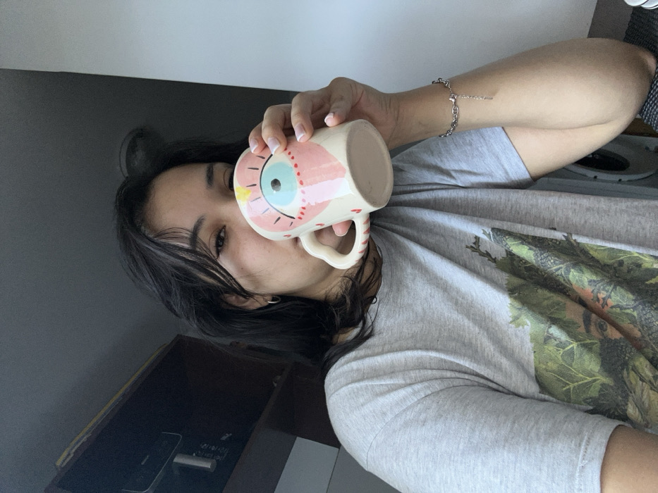 An indoor scene, situated in Villa San Andrés, Argentina, presents a single individual, appearing female, with dark hair, viewed from the upper torso. The subject is wearing a light grey short-sleeved t-shirt with a green and brown nature-themed graphic design partially visible on the chest. A silver-colored chain bracelet with a small dangling charm is present on the left wrist, and a small silver hoop earring is visible in the left ear. The individual holds a cream-colored ceramic mug to their mouth with the right hand. The mug is decorated with a stylized eye design featuring a light blue iris, yellow eyelid, pink markings, and small red hearts on the handle. The background to the upper left reveals a dark wooden cabinet or shelving unit, partially obscuring a small electronic appliance with a screen. The background to the right consists of a lighter-colored wall, and a white circular object is partially visible in the lower right.