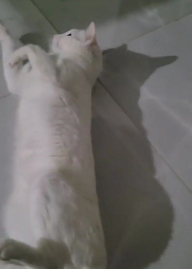 - "A white cat lies on its back on a tiled floor" by FM-lpZ3r2, licensed under CC BY 4.0