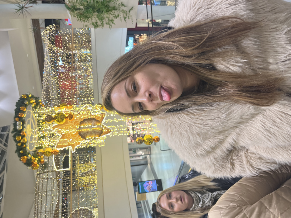 A woman in a cream-colored, fluffy jacket sticks out her tongue toward the camera. Behind her is a Christmas display with golden stars, ornaments, and strings of lights. Another woman, wearing a scarf and jacket, is seated below the first woman. The location appears to be inside a shopping mall, with escalators and storefronts visible in the background. The photo seems to be taken at an angle, possibly as a selfie.