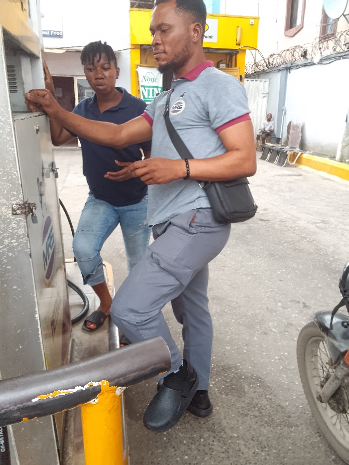 The image depicts a scene at a petrol station in Agani, Nigeria, featuring two individuals near a fuel pump