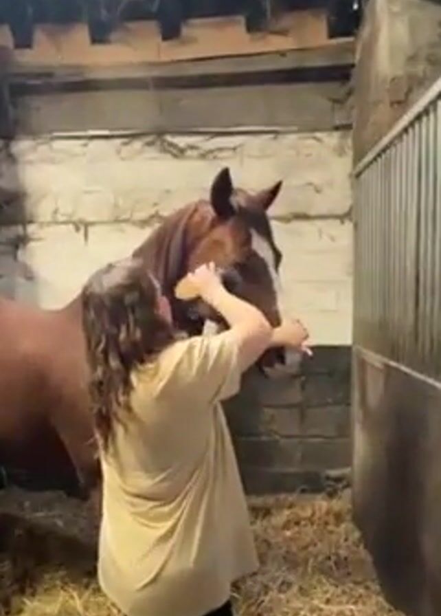 A woman brushes a brown horse in its stall