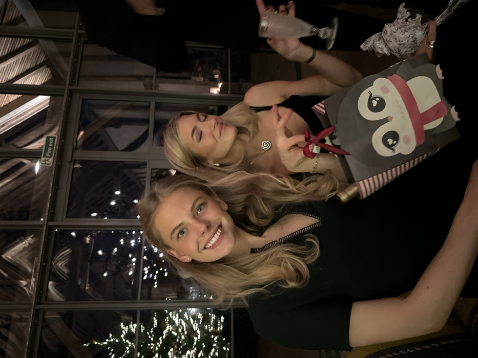 Two blonde women pose indoors. The woman in front smiles, wearing a black dress with cutouts at the shoulders. The other woman makes a peace sign. A gift bag with a cartoon penguin lies in front of her. Above them, a hand holds a glass. A lit Christmas tree is visible through the window. An exit sign is seen by the window pane.