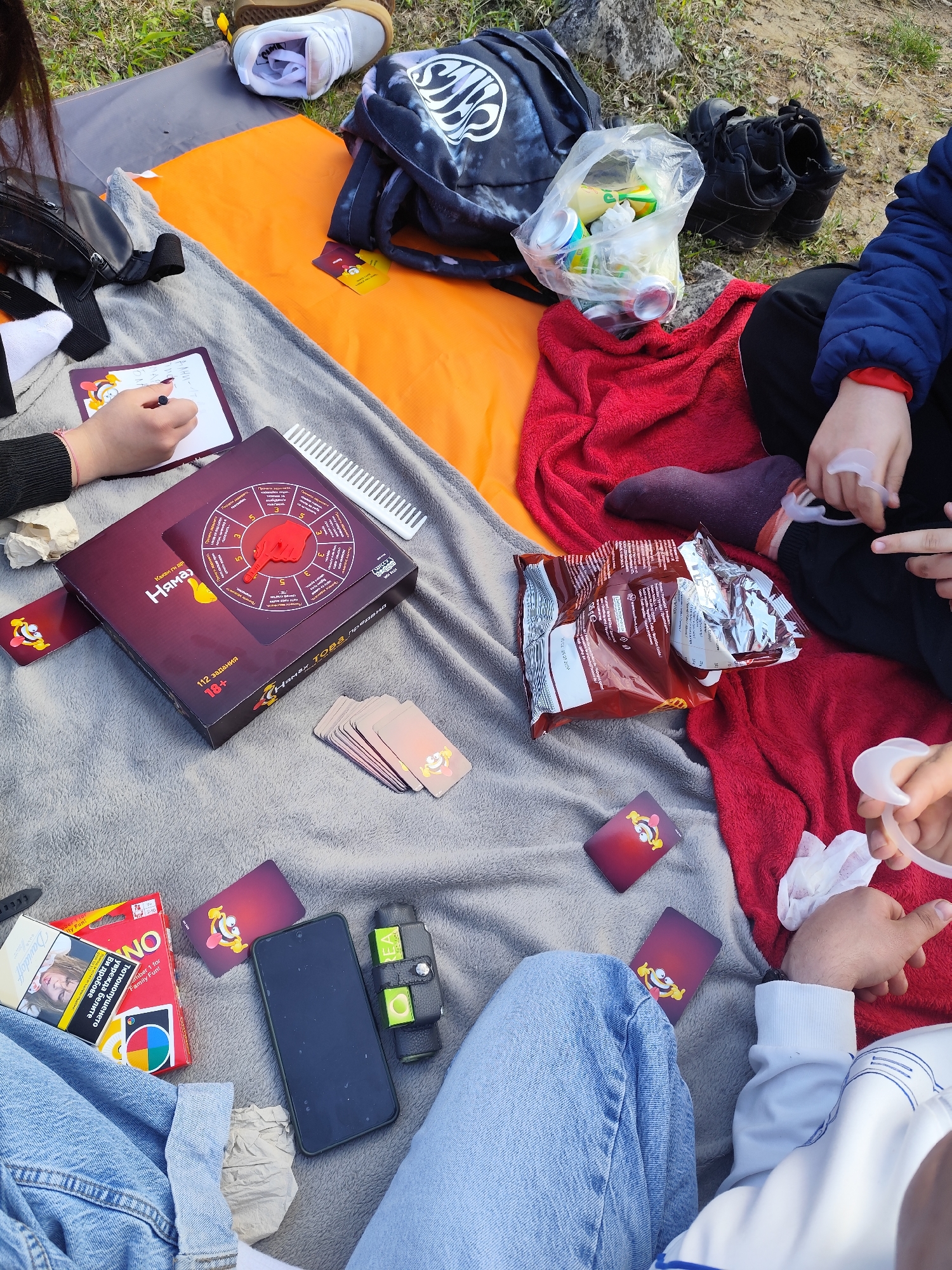 group of people on a blanket outdoors, likely at a picnic. The background suggests an area with grass and possibly trees. People are sitting around the blanket. On the blanket, there is an open board game called "Нямах Това Познание (Nyamakh Tova Poznanie)", cards, a deck of UNO cards, a cell phone, and a pack of Davidoff cigarettes. There are also snacks, a bag of trash, a red towel, and a backpack. One person is writing something on a notepad. The overall scene depicts a casual outdoor gathering with people engaged in games and socializing. The location is unknown.
