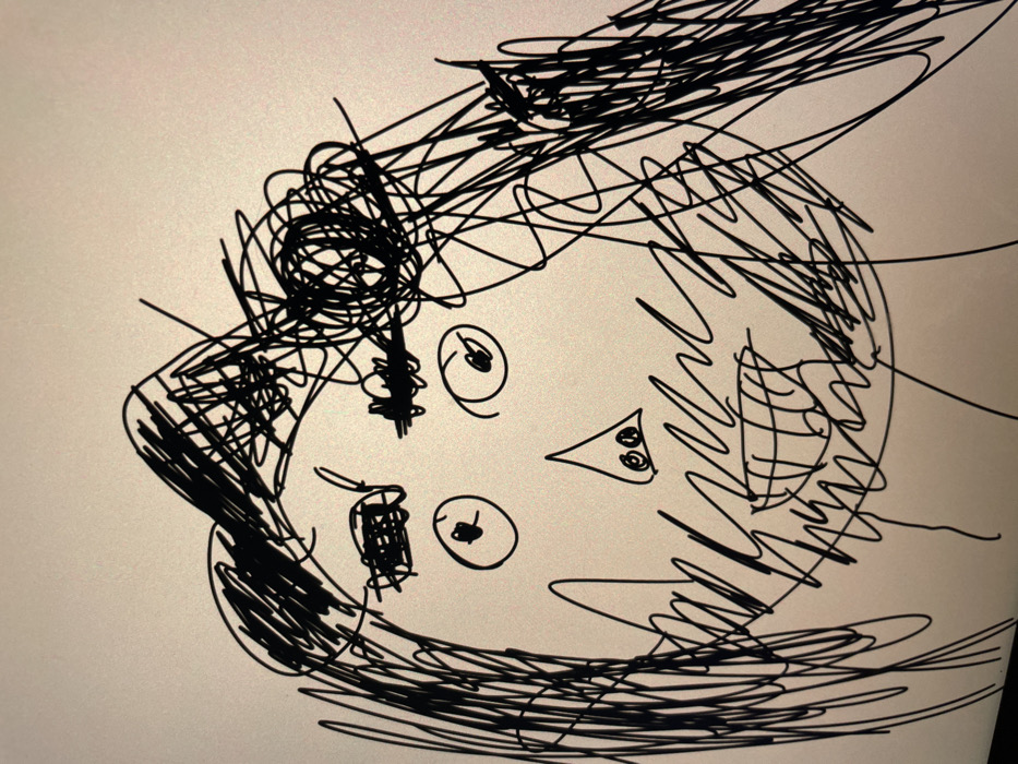 The image displays a digital capture of a crudely rendered, abstract black-and-white line drawing of a human-like face