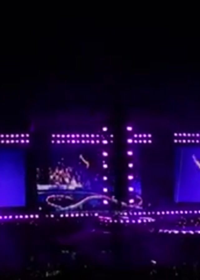 stage at night, lit with purple lights. There are three large screens above the stage, displaying an image of a woman. The crowd is visible in the foreground, but they are not easily distinguished. The camera is still.