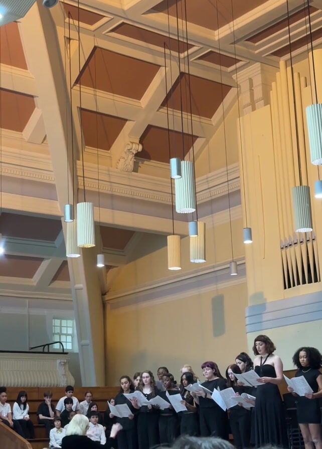 group of singers performing in a large hall. The group consists of about 15 people, mostly women, dressed in black attire and holding sheet music. A conductor stands in front of them, leading the performance. Behind them, a few individuals are seated, possibly additional members or support staff. The hall has a high ceiling with a complex geometric design and long, cylindrical hanging lights. A large organ is visible on the right side of the frame. The overall environment suggests a formal or semi-formal concert setting.