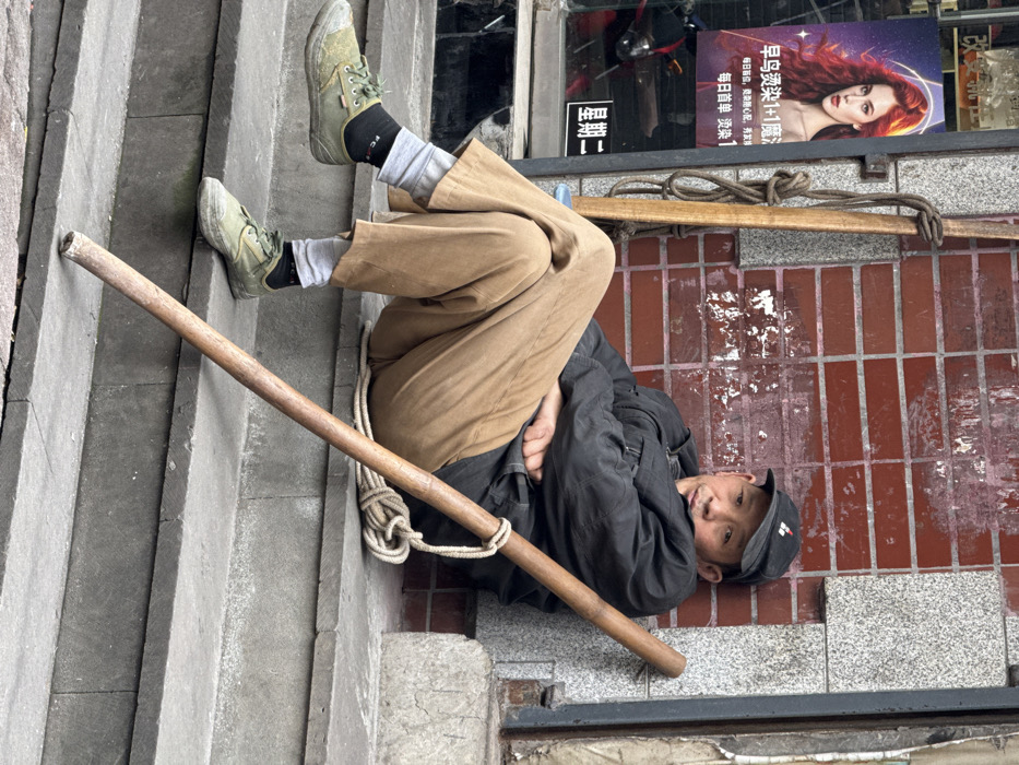 A man lies on his back with his legs elevated on stairs. He wears khaki pants, green shoes, and a black jacket with a cap. A wooden pole runs across his body, secured with rope. A poster with a woman with red hair is visible on the wall behind him. The poster has Chinese characters. The ground consists of red bricks.