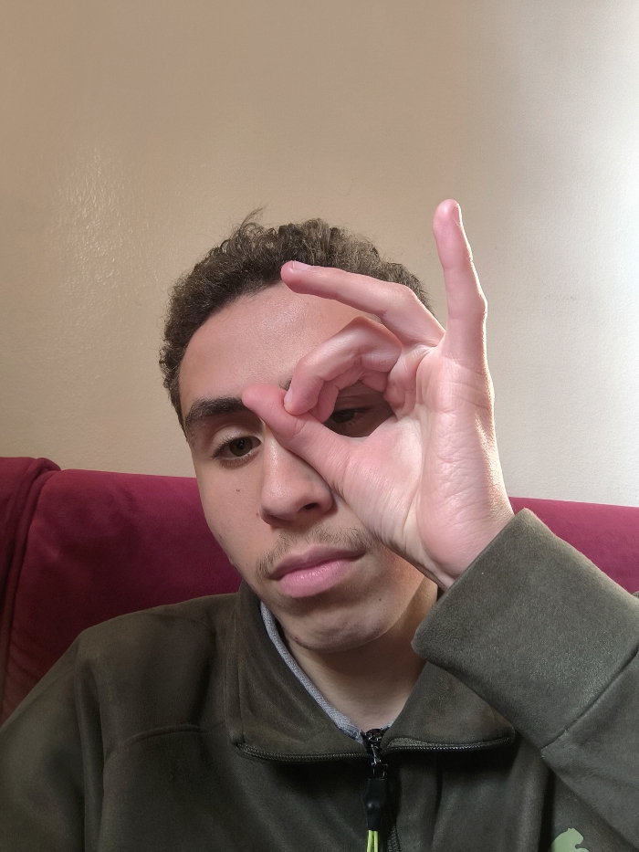 The scene is located in Jirud, Syria. A young male individual, appearing to be in his late teens or early twenties, is depicted from the chest up. He has a light skin tone, short dark curly hair, and a light mustache. He wears a dark olive-green fleece jacket over a grey garment, with a fluorescent yellow-green lanyard string visible near the zipper pull. His right hand forms an "OK" gesture, with the circle positioned directly over his right eye. Both his left eye and the eye visible through the hand gesture are directed at the viewer. His mouth is slightly open, maintaining a neutral expression. The background consists of a plain light beige wall on the right and a deep red upholstered surface on the left.