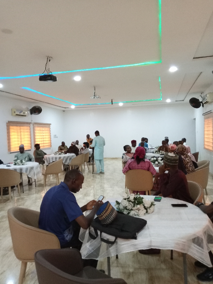 gathering of people in an indoor space in Yola, Nigeria. The scene is set in a large, well-lit room with white walls and a white ceiling. The ceiling features a decorative lighting system with green and blue LED strips, giving the room a modern look. Several round tables are arranged throughout the room, each covered with a white tablecloth. The tables are surrounded by brown chairs, and some of the chairs are occupied by people. One man in a blue shirt is seated at a table with a black bag and phone in hand. He appears to be looking at his phone. Other people are seated at the other tables, some engaged in conversation, others with their phones. The image is taken from a perspective slightly elevated from the seated guests. The room appears to be a conference or dining hall, with the presence of several people engaging in conversations and activities associated with those settings. The overall atmosphere in the image appears to be relaxed and conversational.