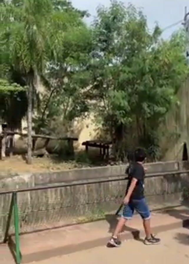 Three boys walk along a fenced walkway at a zoo on a sunny day. The boy in the front wears a black t-shirt and denim shorts, the boy in the middle wears a yellow t-shirt and gray shorts, and the boy in the back wears a gray t-shirt and dark shorts. They approach an animal enclosure that contains trees, benches, and a concrete wall. The camera pans to show the full enclosure where a possible animal is seen on the far left. A sign is visible in the middle of the enclosure. The sky is partly cloudy.
