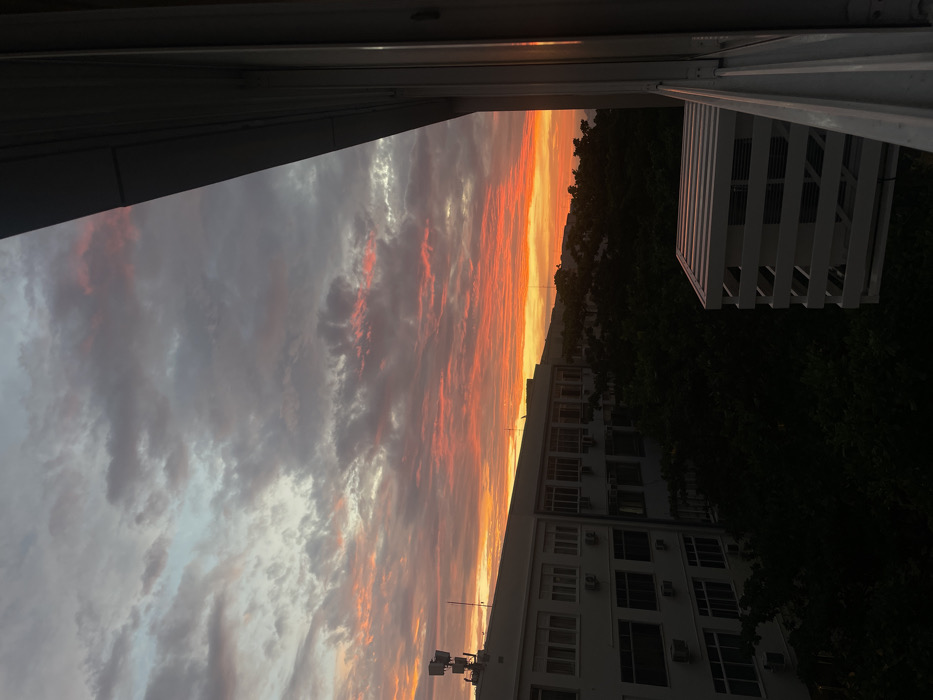 A vivid sunset sky, blending from pale blue to intense orange and red hues, is partially framed by architectural elements. A building with multiple windows and air conditioning units rises on the right, alongside foliage. A white, lattice-like structure adds another layer of depth. The view is captured from an interior space, looking outward towards the colorful horizon.