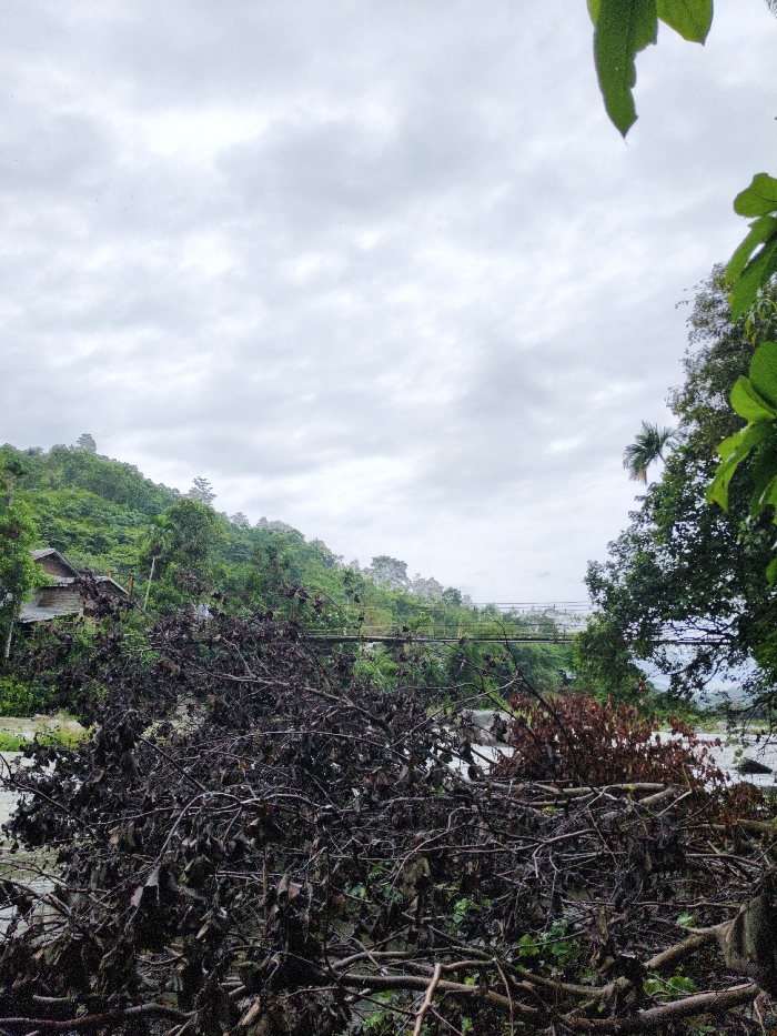 A cloudy sky looms over a lush, green hillside dotted with trees and a small house. A bridge spans a river, partially obscured by dark, tangled branches and leaves in the foreground. A few trees frame the right side of the image. The scene appears overcast and damp, potentially after a rain shower.