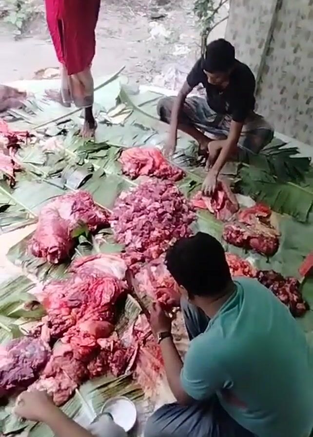 The video captures the process of butchering and cutting up meat outdoors. The setting appears to be a rural area, likely in a South Asian country, with a dirt path visible in the background. **People:** Several men are present. Some are actively involved in butchering the meat, while others are either observing or passing by. The men involved in the butchering are wearing casual clothing, such as vests, lungis, or T-shirts. One man wears a red shirt. **Objects:** The most prominent object is the large quantity of raw meat spread out on banana leaves placed on the ground. Other objects include: * Knives of varying sizes used for cutting the meat. * A cleaver. * Plates containing snacks. * Red plastic basins. * Buckets, presumably for collecting meat or waste. * Banana leaves used to create a sanitary surface for cutting the meat. **Actions:** The primary activity is the butchering and cutting up of meat. The men are seen using knives to separate and chop the meat into smaller pieces. Some are squatting or sitting on the ground, while others are standing or walking around. **Interactions:** The men work together, with some focusing on cutting larger pieces and others on further processing the meat. There's likely communication and coordination between them. **Environment:** The setting is outdoors, with trees and greenery visible in the background. The ground is mostly dirt. The atmosphere seems informal and communal, suggesting this may be a festive occasion or a community event. The presence of a dog and red plastic basins adds to the scene's messy and informal nature.