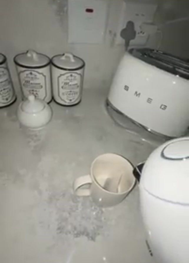 person pouring water from a white electric kettle into a white mug. Two tea bags are already in the mug. The mug is on a countertop. Behind the mug, there is a white Smeg toaster, three white ceramic containers with black lettering that say "Sugar", "Paris Maison", and "Coffee", and two electrical outlets. One of the outlets has a plug in it. There is also a light switch. The countertop is a light grey color.