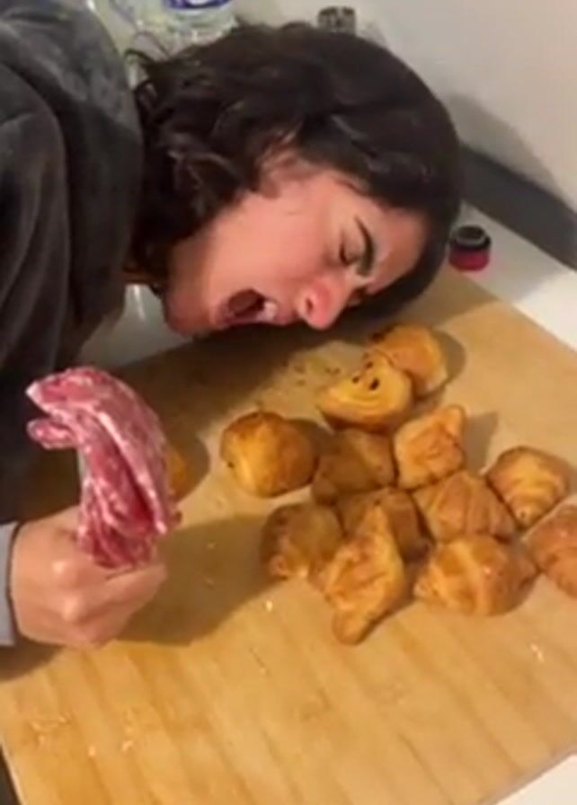 A woman with dark curly hair is next to a wooden cutting board with about a dozen croissants. In her left hand, she holds a wad of raw salami. She suddenly throws her head back and screams, then smiles at the camera. She's wearing a gray hoodie. There are water bottles on a counter behind her, and cleaning supplies off to the right.