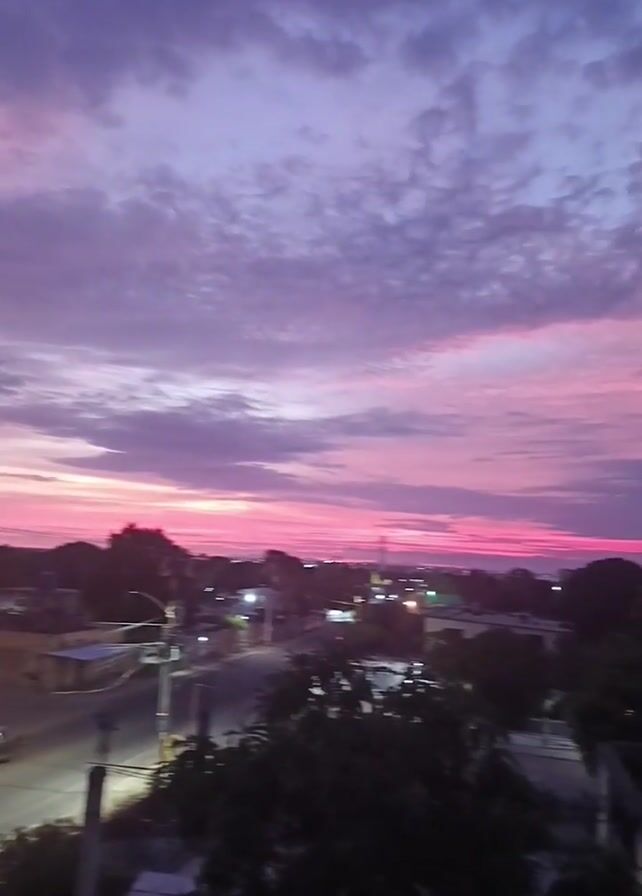 landscape at dusk or dawn. The sky is filled with pink and purple clouds. The video is taken from a high vantage point, overlooking a neighborhood with houses and trees. A car with its headlights on is driving on a street. The video is blurry. The camera slowly pans from left to right. The watermark "Infinix NOTE 40Pro" is visible in the lower-left corner. Someone can be heard speaking in the background.