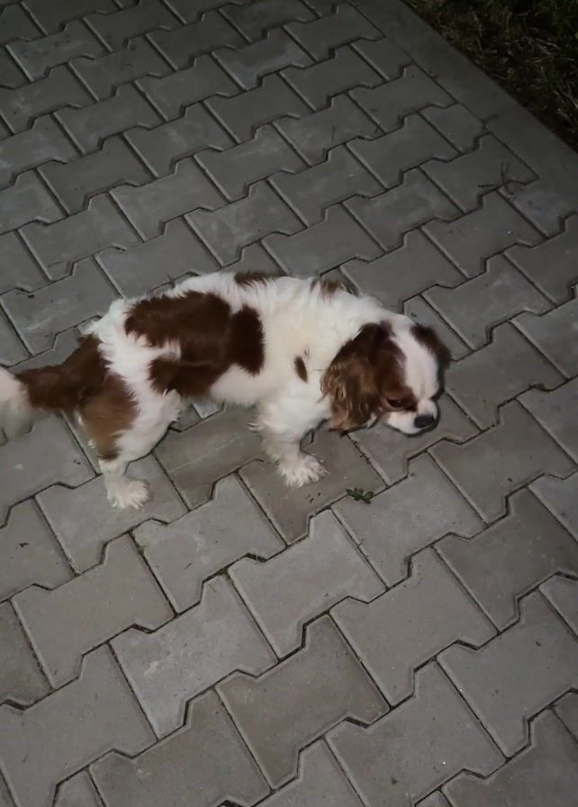 A brown and white Cavalier King Charles Spaniel stands on a paved surface of interlocking gray blocks. The dog is sniffing at the ground near a small piece of green vegetation. The lighting is dim, suggesting it might be evening or night. There is a patch of grass visible in the background.