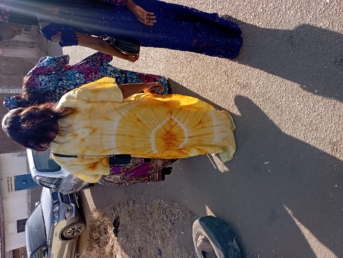 Three women walk on a street. The woman closest to the camera wears a yellow and white patterned dress with a black purse. The woman beside her wears a colorful patterned dress. The third woman wears a blue dress. Cars are parked to the side of the street. A tire lies on the side of the road.