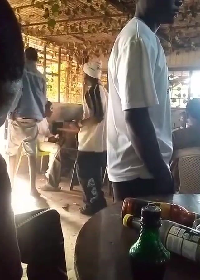 The video takes place in an open-air establishment with a roof covered in straw and leafy plants. Several men are present, some standing and moving while others sit at tables. A man in a white t-shirt stands near the camera. Another man is seen dancing in the middle of the room, and others seem to be talking and socializing. Several bottles are visible on a table in the foreground. The overall atmosphere appears relaxed and social.