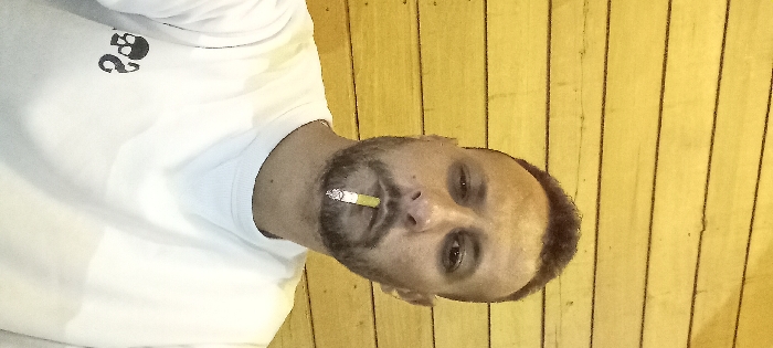 A bearded man in a white shirt smokes a cigarette. He has short hair and a medium complexion. The backdrop is comprised of vertical wooden planks, painted a pale yellow hue. His shirt has a small, black skull-like image on the upper left area. He appears to be looking directly at the camera.