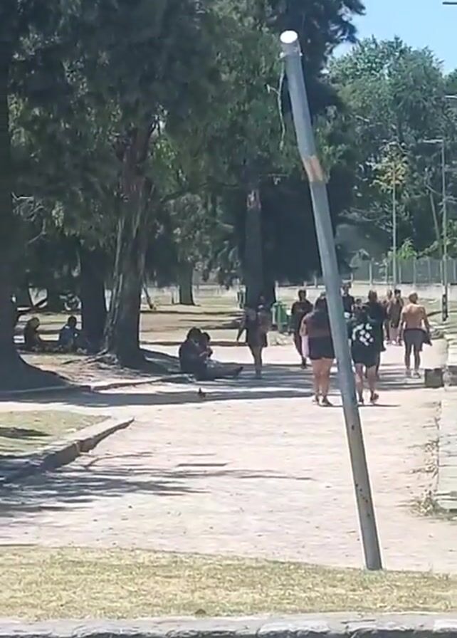 park on a sunny day. People are walking on the paths or sitting on the grass. There are many trees, some with yellow flowers, and some monuments. A man in a baseball cap walks past the camera carrying a plastic bag. The camera pans from right to left and upwards. The sound of music can be heard.