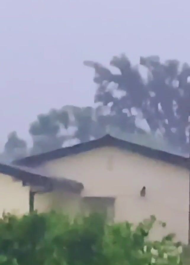 The video depicts a residential scene during heavy rain. A house with a dark roof is visible through green foliage. In the background, trees sway in the wind, obscured by the rainfall. The sky is overcast and grey, adding to the stormy atmosphere.