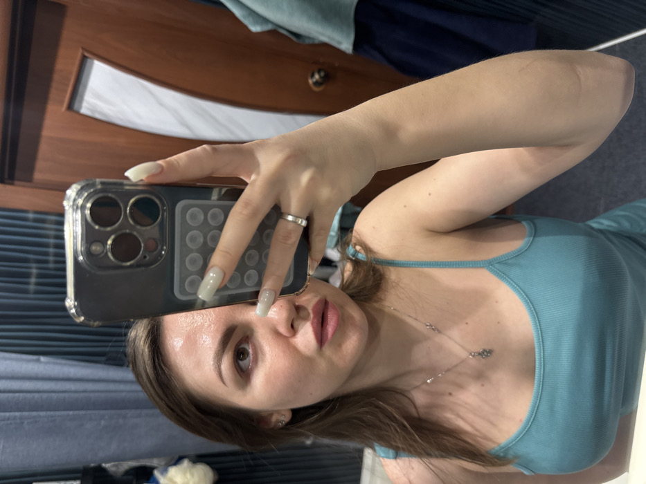 The image depicts an adult female taking a mirror selfie indoors