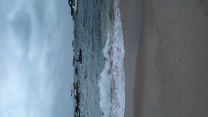 The scene depicts a cloudy sky over a beach. The sea is active with waves, and several boats are visible on the water. The sand is damp, indicating recent wave action. The atmosphere is overcast, giving the image a muted color palette. The orientation of the image is vertical, which emphasizes the height of the waves and the depth of the sky.