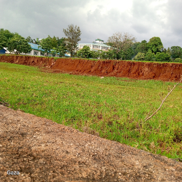 The image depicts an outdoor landscape in Bobaracho ward, Kenya, under an overcast sky. In the foreground, a granular, light brown concrete surface is visible. The midground features an expanse of green grass, from which a sparse, dried plant stem projects from the lower right. Beyond the grass, a prominent, horizontal embankment of exposed red-brown earth, showing signs of a cut or erosion, spans across the frame. In the background, numerous green trees and foliage partially obscure several buildings. Among these, a multi-story structure with light-colored walls and a distinctive tiered green roof is visible to the right. No individuals, specific actions, or interactions are present.