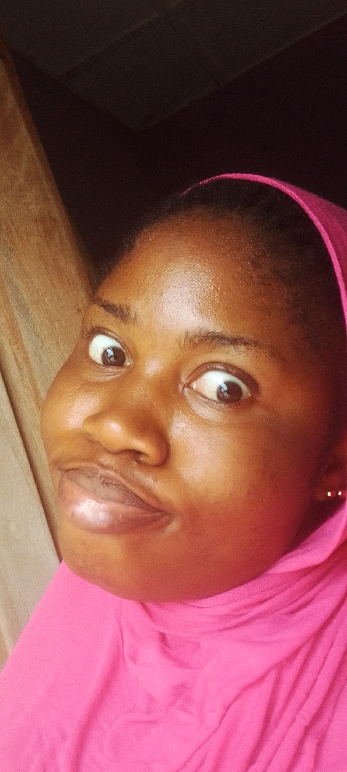 The image displays a close-up portrait of an individual with dark skin, observed from the chest up. The subject wears a vivid pink garment, consistent with a head covering, which frames the face and covers the neck and shoulders. Two small, round gold stud earrings are visible on the subject's right earlobe. The subject's eyes are wide open, with visible pupils, and directly focused on the viewer. The mouth is slightly parted, revealing full lips with a subtle upward curvature at the corners. The forehead exhibits a noticeable reflective sheen. The background to the subject's left features a light brown, vertically oriented wooden surface displaying prominent grain patterns. The upper right quadrant of the background is dark and largely indistinct, suggesting an interior space with limited illumination. The image itself provides no specific visual cues to ascertain its precise location within the city of Adankolo, Nigeria.