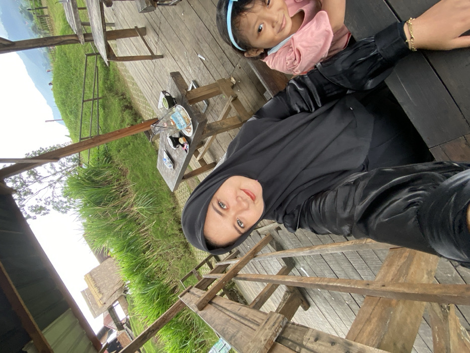 This image captures an outdoor scene on a raised wooden deck in Selotapak, Indonesia. The foreground features an adult female and a young female child. The adult female, positioned centrally, wears a black hijab and a black long-sleeved top, exhibiting light-colored eyes and reddish-brown lipstick. She is holding a device, likely a smartphone, directed towards herself, consistent with taking a selfie, and looks directly into the camera. To her right, a young female child is partially visible, wearing a pink top and a light blue headband, also looking towards the camera. Behind the individuals, a rustic wooden table displays several cups, plates containing what appear to be food remnants, and a mobile phone. The immediate environment consists of wooden floorboards and a wooden railing. The background reveals rolling green hills covered with tall grasses, a wooden fence, and distant structures with thatched roofs, all beneath an overcast sky.