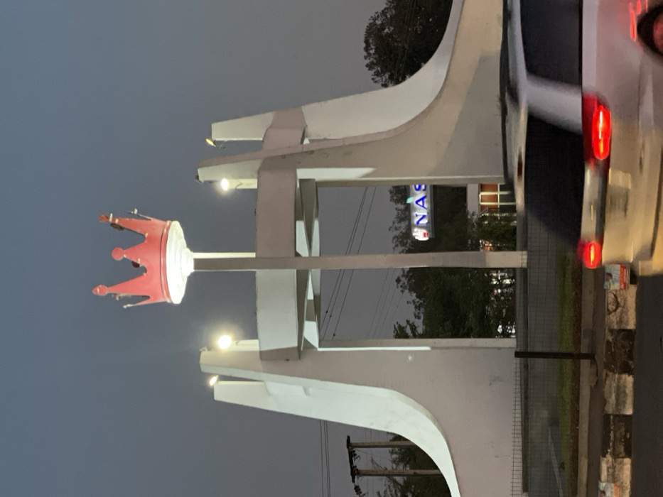 The image captures the Crown Roundabout in Jos, Plateau State, Nigeria, during dusk or night