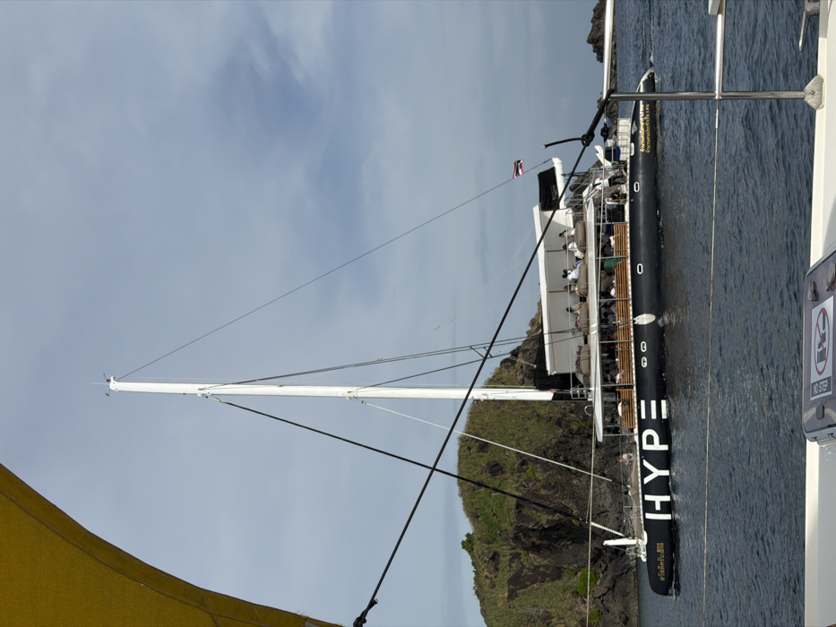 - "A black and white catamaran, identified by the large white text "HYPE" on its hull and additional Thai script, navigates calm ocean waters off Rawai, Thailand" by FM-PcEqo1, licensed under CC BY 4.0