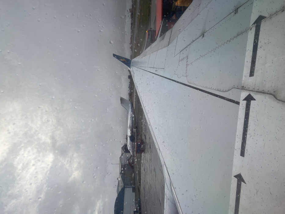 - "The image depicts an airport tarmac scene viewed from the window of an aircraft, exhibiting water droplets, indicating rain or recent precipitation" by FM-ZkP5p1, licensed under CC BY 4.0