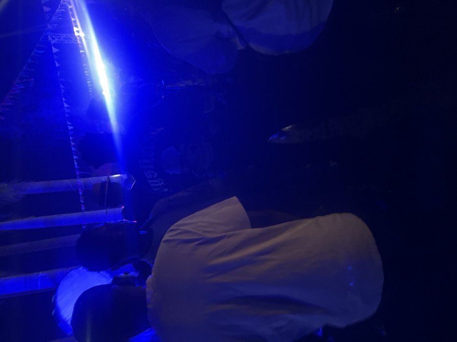 Under intense blue stage lighting, the image captures a close-up scene likely at a concert or event. A figure clad in a light-colored shirt sits prominently in the foreground. Adjacent to them, someone with a dark t-shirt is visible. The backdrop includes partial views of the stage with a metal structure and some dangling flags. The overall atmosphere is lively and charged with energy.