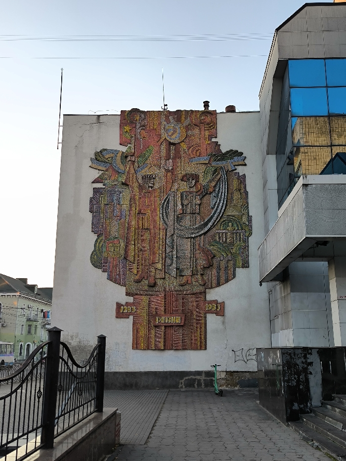 An exterior urban scene in Rivne, Ukraine, features a large, multi-colored mosaic affixed to a white building facade, under a clear, light blue sky