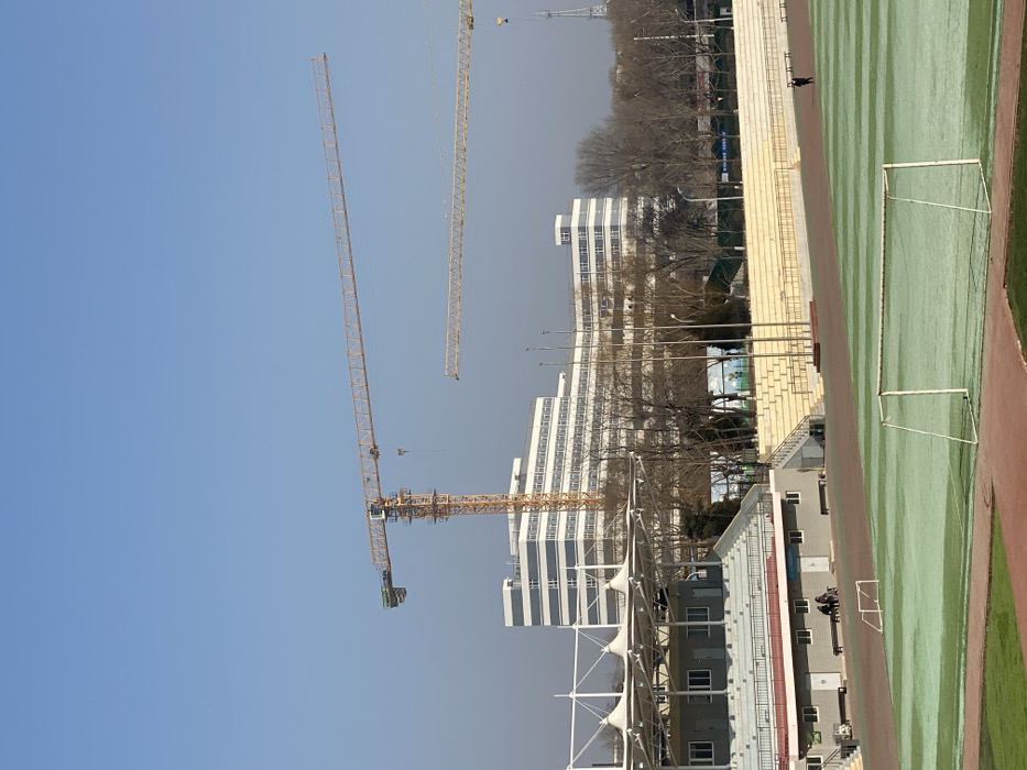 The image displays a mix of construction and recreation. Two tall construction cranes dominate the left side against a pale blue sky. Beside the cranes is a modern white building with multiple stories. To the right, there is a partial view of a sports stadium, with green field, track, and stadium seating. The stadium is mostly empty. The image presents a contrast between ongoing development and recreational space.