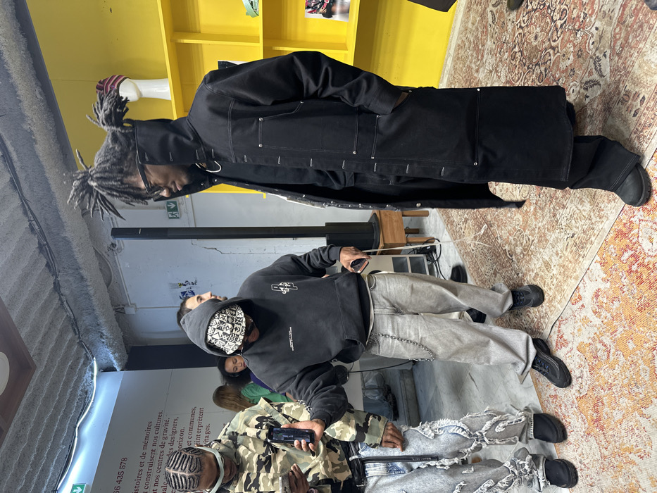 The scene depicts an interior view of a commercial or event space located in Paris, France. The environment features white walls, one of which displays French text and a green emergency exit pictogram. A yellow shelving unit is visible on the right, containing various items, including a striped beanie on a mannequin head. The ceiling is raw concrete with visible conduits, and the floor is covered by a patterned rug in shades of orange, brown, and off-white. Three individuals are prominently featured, with two others partially visible in the background. From left to right: 1. A person wearing a camouflage-patterned hooded jacket, light-wash distressed jeans, and dark shoes stands looking down at a black smartphone held in their left hand. 2. A second individual, wearing a dark grey hooded sweatshirt, light-wash baggy jeans with a silver chain, and a black and white patterned bucket hat, holds a black smartphone horizontally, directing it towards the right. A white cable or cord trails from their left hand or pocket. This person is looking towards the individual on the right. 3. A third person, dressed in a long black hooded overcoat with contrasting white stitching, black trousers, and dark boots, stands on the right. This individual has dreadlocks styled into two prominent upward knots and wears black sunglasses. They face towards the left, looking at the central figure, with their left hand in a coat pocket. A male individual with short dark hair is partially visible behind the central figure, also looking towards the right. The individuals appear to be engaged in an interaction within the described indoor setting.