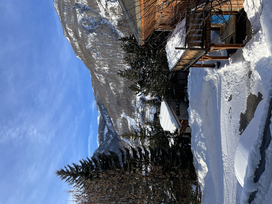 A snowy scene features a mountainside under a blue sky with wispy clouds. A building with a wooden exterior sits on the right, covered in snow. Pine trees are interspersed in the landscape, with more buildings nestled in the valley. A snow-covered path leads alongside the building, suggesting a winter environment in a mountainous region.