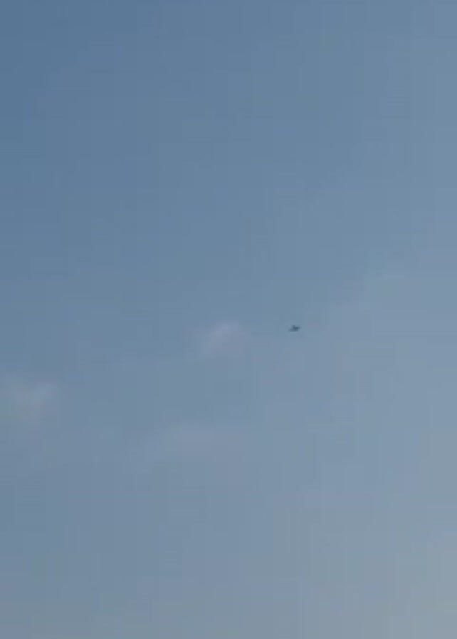 clear, blue sky with a few wispy clouds near the bottom of the frame. A small airplane is visible in the distance, moving across the sky. At one point, another similar-looking plane appears nearby. The camera remains stationary throughout the video.