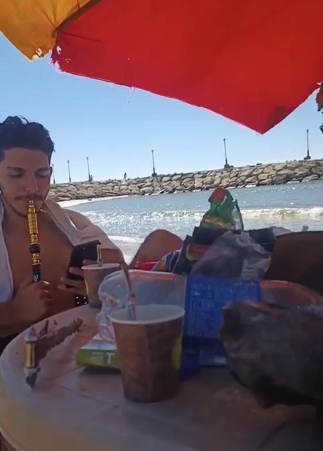 man sitting at a plastic table on a beach, under a red and yellow umbrella. The man is shirtless with a towel over his shoulder, holding a hookah in one hand and a cell phone in the other. On the table are several paper cups, food wrappers, and other personal items. In the background, the ocean is visible with a rock barrier extending out into the water. The sky is clear and blue. The camera moves slightly, focusing more on the view of the ocean.